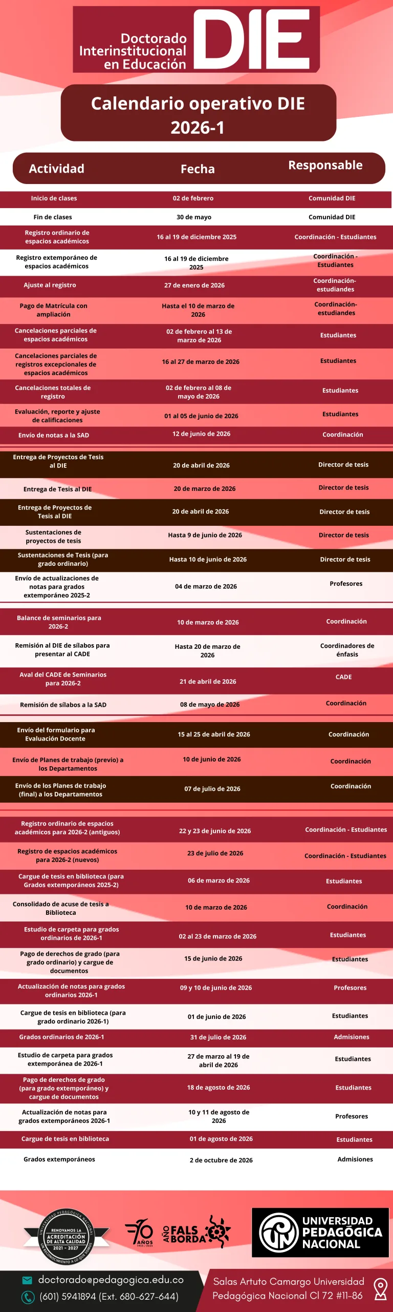 Desde la coordinación académica y el equipo administrativo del Doctorado Interinstitucional en Educación se presenta a continuación el Calendario Operativo para el periodo académico 2026-1. En este calendario podrán encontrar lo relacionado a las fechas que corresponden a los procesos administrativos y académicos para estudiantes y docentes dentro del programa: