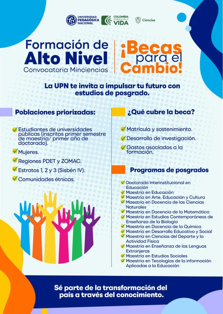 La Universidad Pedagógica Nacional (UPN) convoca a los interesados en aplicar a las “Becas para El Cambio” Formación en Maestrías y Doctorados, ofertadas porel Ministerio de Ciencia, Tecnología e Innovación (Convocatoria 975 de MinCiencias).